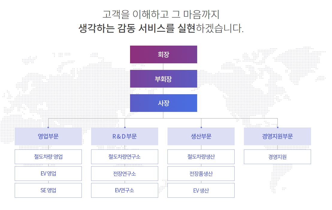 - 철도차량 사업: 전동차, 전기기관차, 객차, 화차, 신호장비, 검수설비 등 철도차량 전반에 걸친 제품과 서비스를 제공합니다.