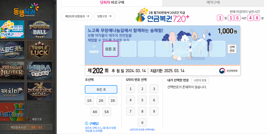 - 각 회차별 1조~5조, 000000~999999번호로 구성된 복권 중 마음에 드는 번호를 선택합니다.