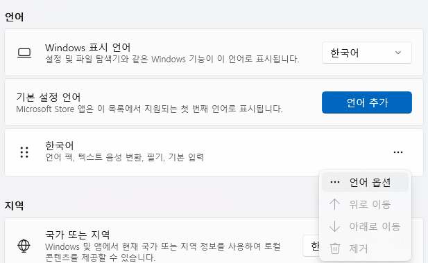 언어 및 지역에서 볼 수 있는 한국어 칸에서 ***을 클릭합니다.