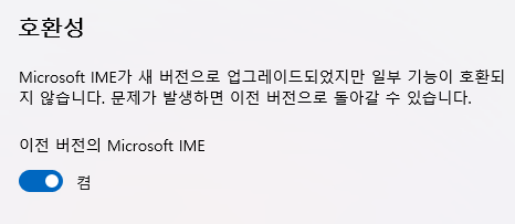 이전버전의 Microsoft IME 끔 옆의 버튼을 클릭